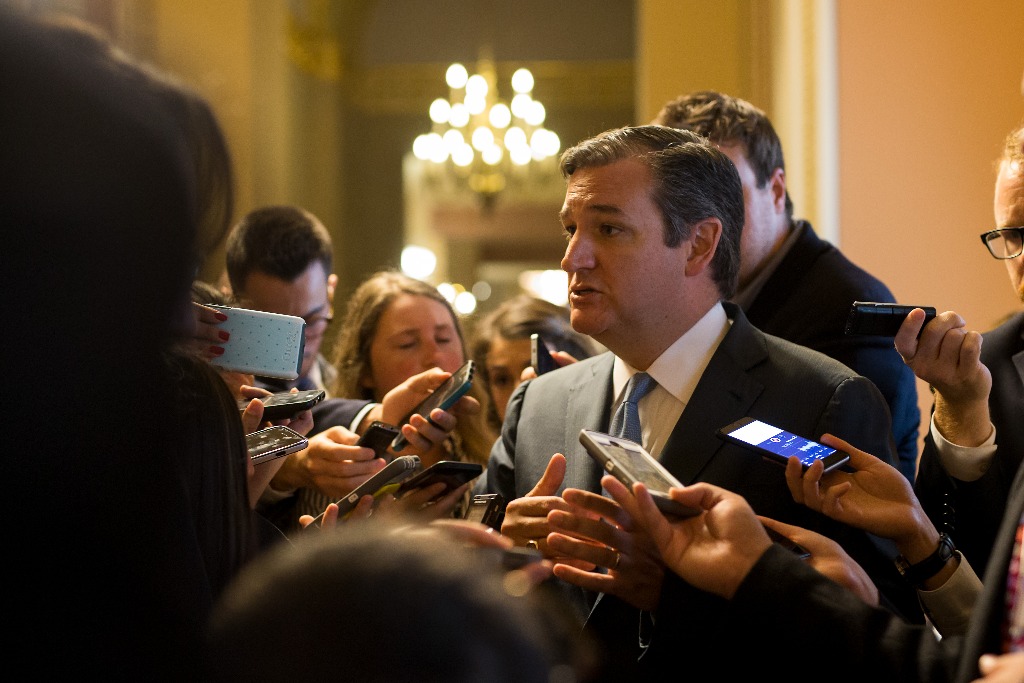 2017年7月13日,在美国华盛顿国会山,参议员克鲁兹出席会议后被记者包围。(新华社发,沈霆摄)