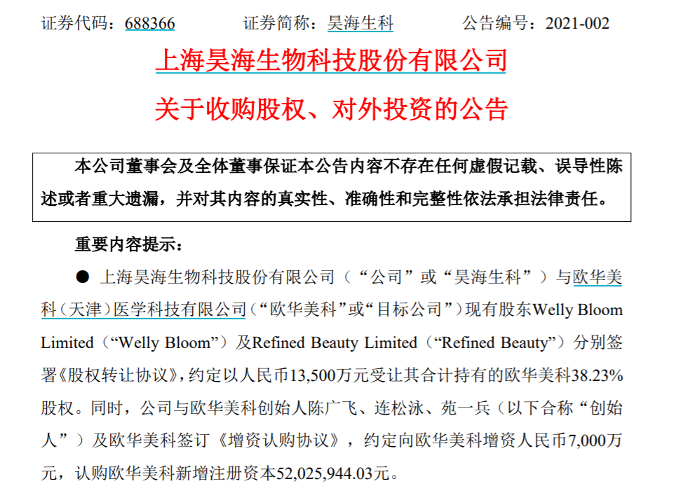 2月21日晚间,昊海生科发布公告称,公司与欧华美科(天津)医学科技有限公司现有股东Welly Bloom Limited及Refined Beauty Limited分别签署《股权转让协议》,约定以人民币1.35亿元受让其合计持有的欧华美科38.23%股权。同时,公司与欧华美科创始人陈广飞、连松泳、苑一兵及欧华美科签订《增资认购协议》,约定向欧华美科增资人民币7000万元,认购欧华美科新增注册资本5202.59万元。本次交易完成后,公司将以共计人民币2.05亿元总投资款获得欧华美科63.64%的股权,欧华美科创始人将持有剩余36.36%的股权。