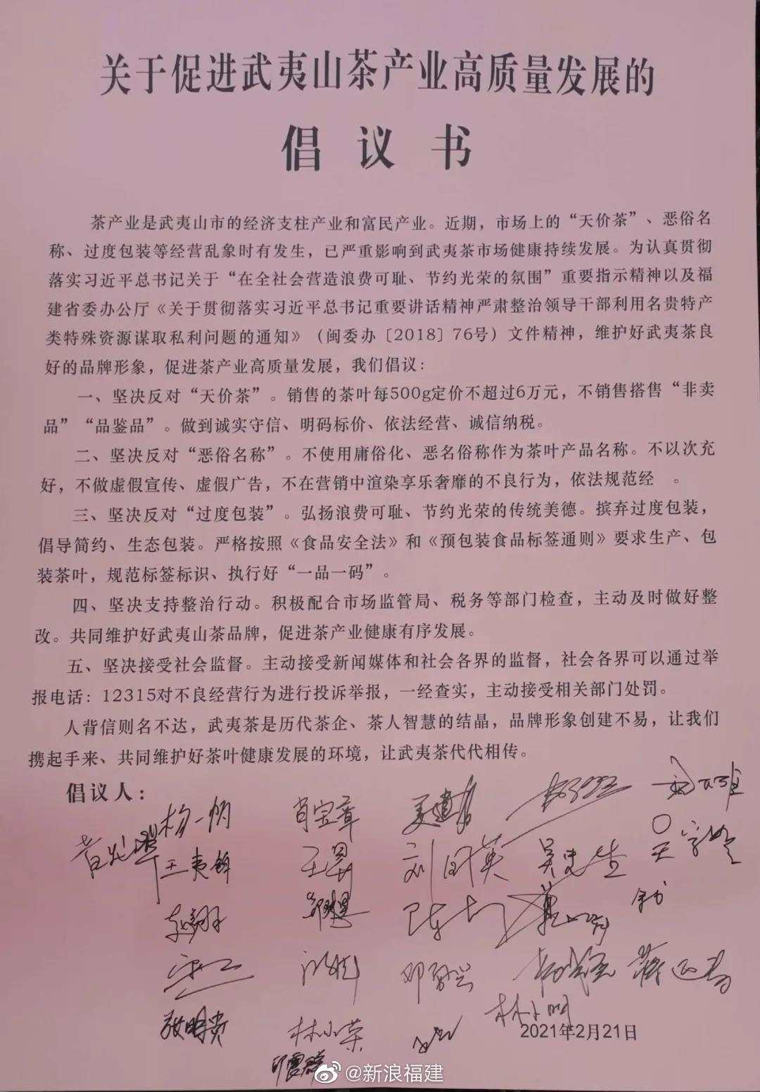 21日下午,武夷山市召开促进茶叶市场健康发展推进会,26家曾出现在网传“天价茶”榜单上的武夷山茶企负责人共同签署《关于促进武夷山茶产业高质量发展的倡议书》,坚决反对“天价茶”“恶俗名称”“过度包装”,承诺不做虚假宣传,规范经营管理,不销售“非卖品”“品鉴品”,自觉接受监督。