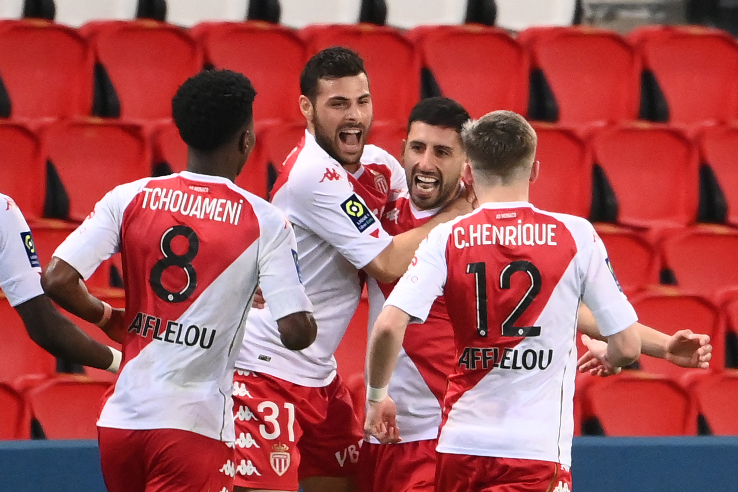 2月21日,摩纳哥队球员马里潘(右二)在进球后和队友庆祝。新华社/法新