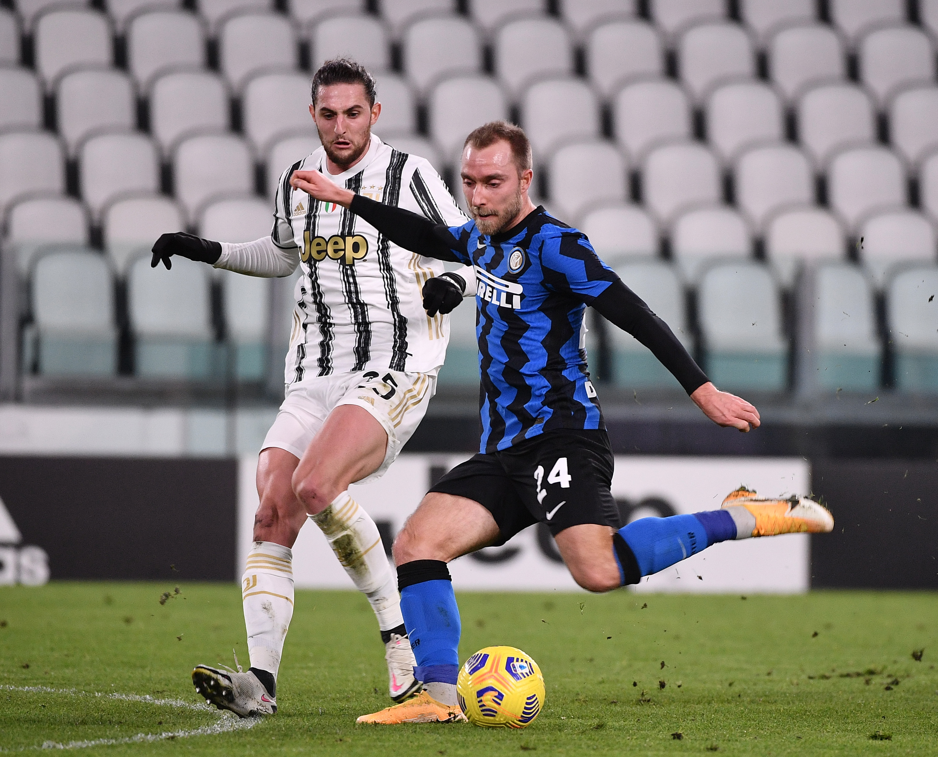 2月9日,国际米兰队球员埃里克森(右)和尤文图斯队球员拉比奥拼抢。新华社发(费代里科·塔尔迪托 摄)