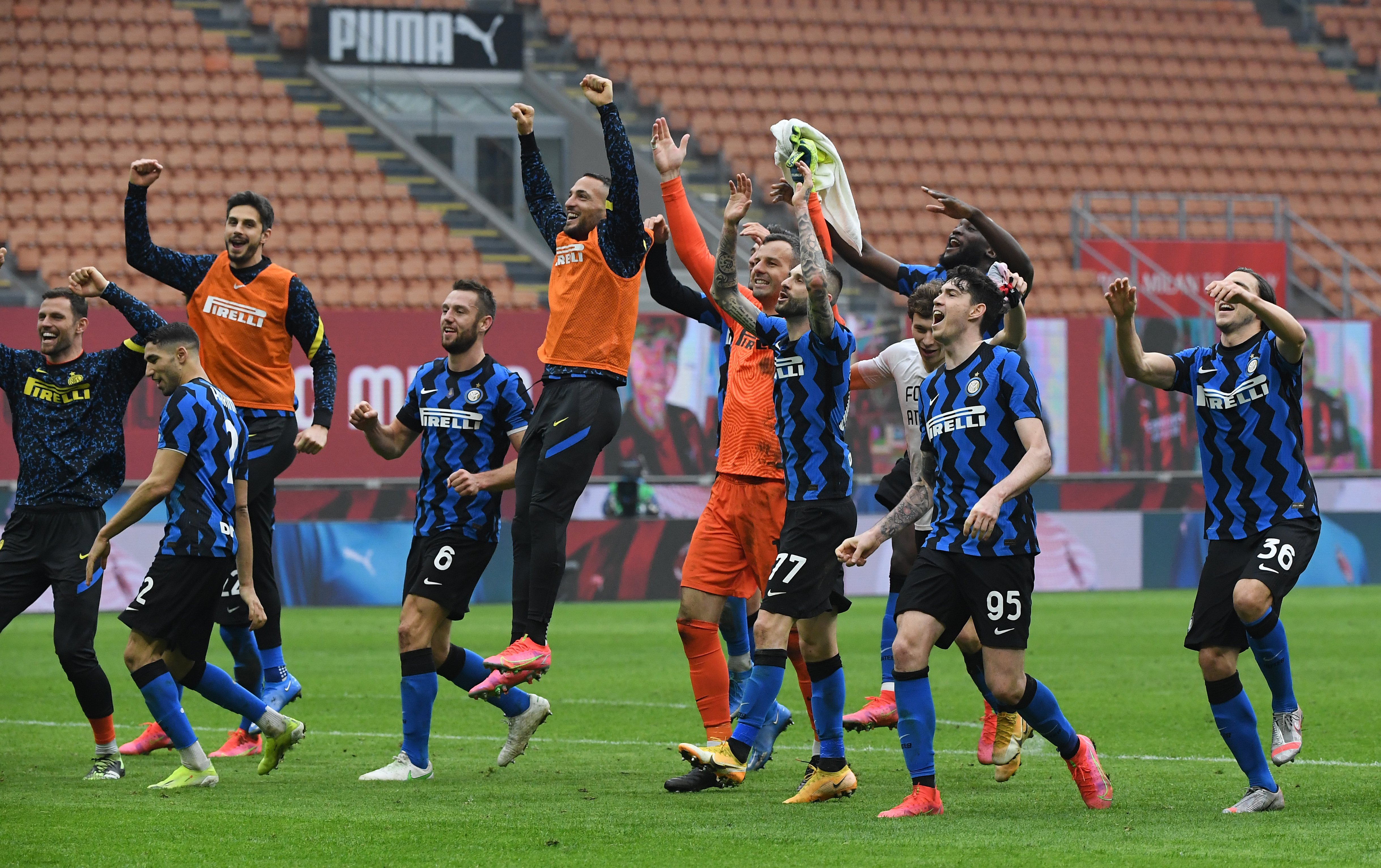 2月21日,国际米兰队球员在赛后庆祝。新华社发(阿尔贝托·林格利亚 摄)