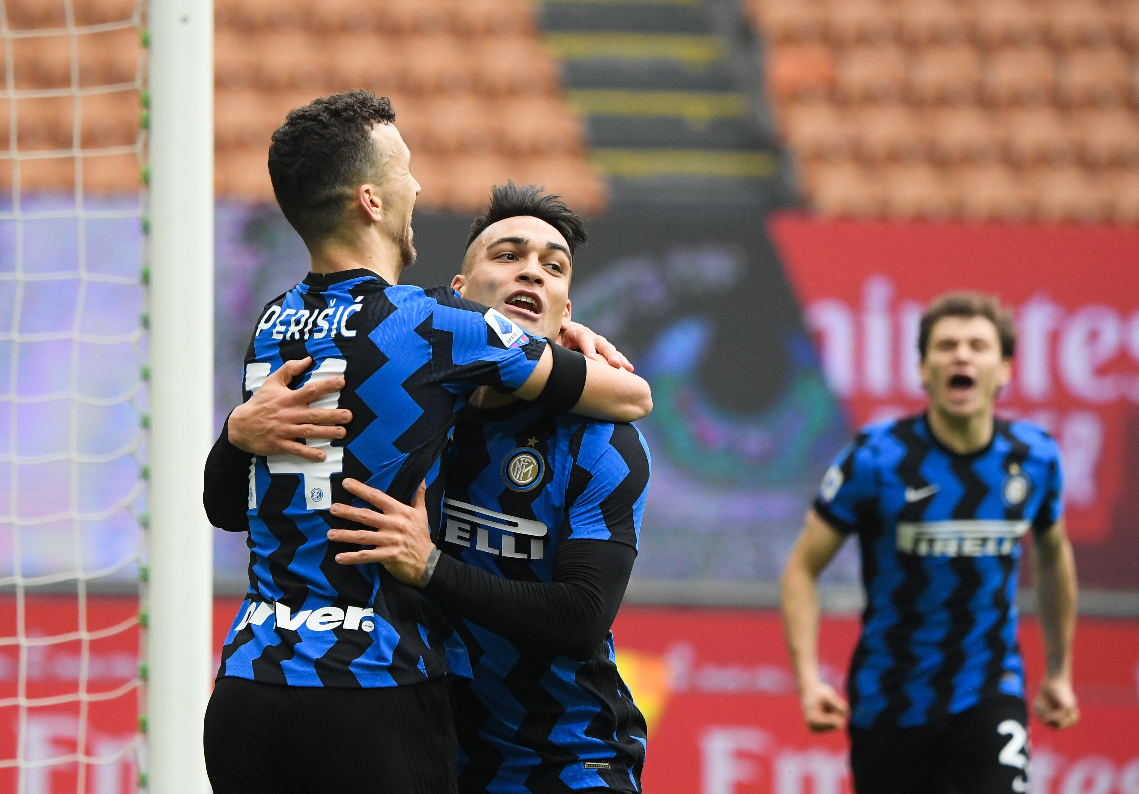 2月21日,国际米兰队球员劳塔罗·马丁内斯(前右)在攻入球队第二粒进球后和队友佩里西奇庆祝。新华社发(阿尔贝托·林格利亚 摄)