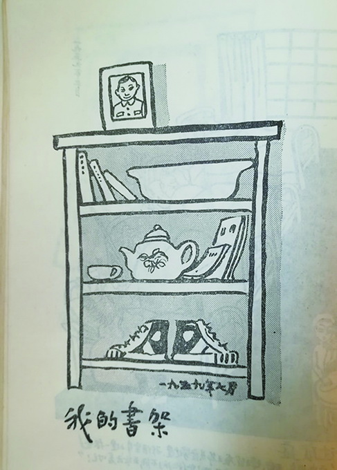 最早在报刊上见到一幅漫画《我的书架》,令人忍俊不禁:三层的书架,底层由一双头朝两边的大球鞋占领;二层居中一个大茶壶,左边一只茶杯,右边斜着一二几乎滑落的本子;三层一只脸盆占据大半,只左边稀拉着三本不知何时摆上的书。书架顶上,还有一幅应该是书架主人的照片。模样倒还大致周正。这其中当然有夸张,可笔者见到一些人办公室或宿舍的书架,摆的物件与漫画虽有不同,可情形却是一致。故见到此漫画,不禁莞尔。我注意到了漫画的作者是华君武。