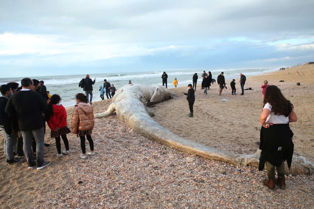 2月19日,在以色列南部一个基布兹(集体农庄)附近的海滩,人们聚集在一头死去的鲸周围。环保人士认为,这头鲸之死或与摄入大量沥青有关。(新华社发,穆阿迈尔·阿瓦德摄)