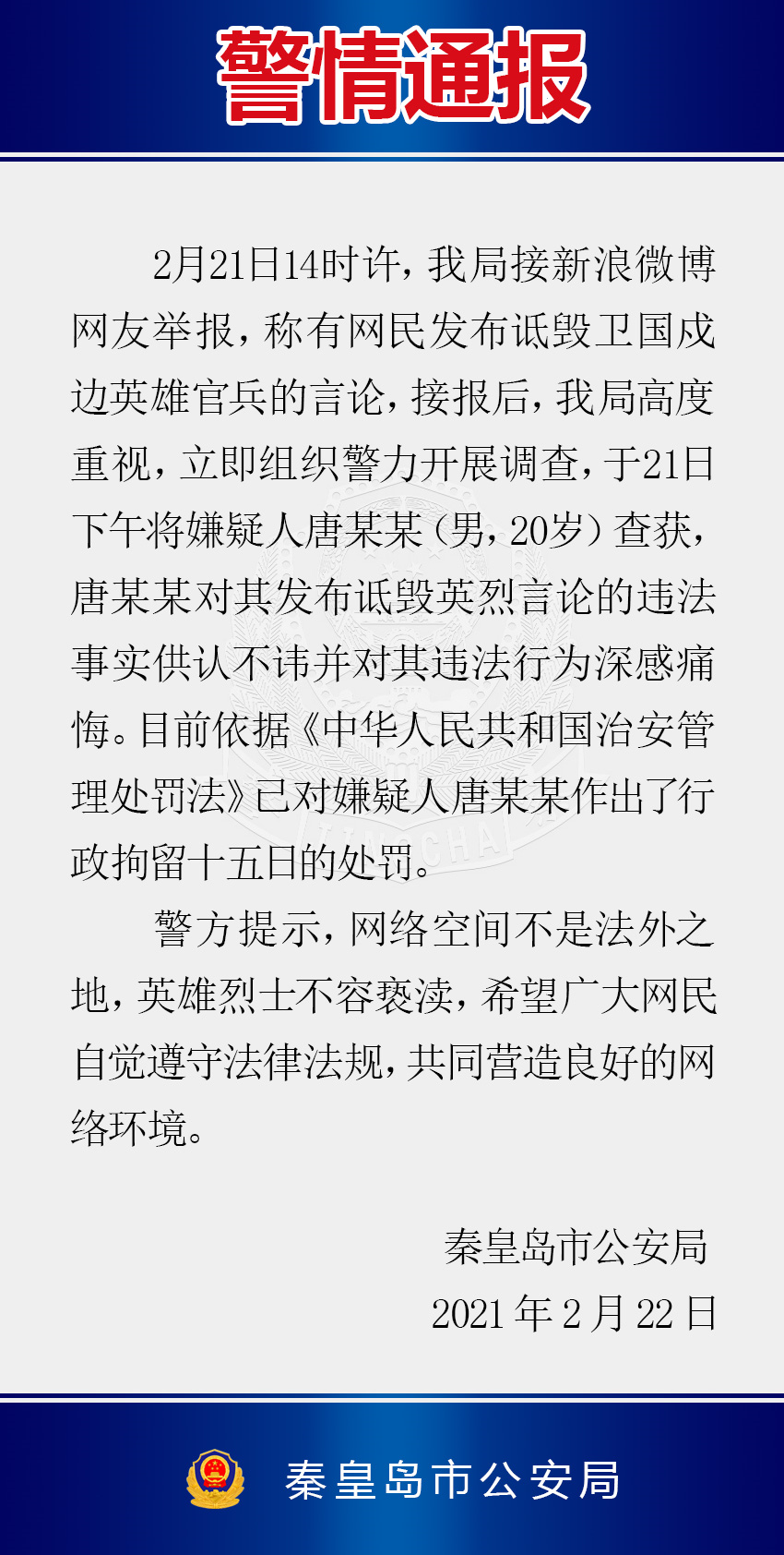 据“秦皇岛公安”微信公众号消息,2月21日14时许,秦皇岛市公安局接网友举报,称有网民发布诋毁卫国戍边英雄官兵的言论,接报后,秦皇岛市公安局高度重视,立即组织警力开展调查,于21日下午将嫌疑人唐某某(男,20岁)查获,唐某某对其发布诋毁英烈言论的违法事实供认不讳并对其违法行为深感痛悔。目前依据《中华人民共和国治安管理处罚法》已对嫌疑人唐某某作出了行政拘留15日的处罚。