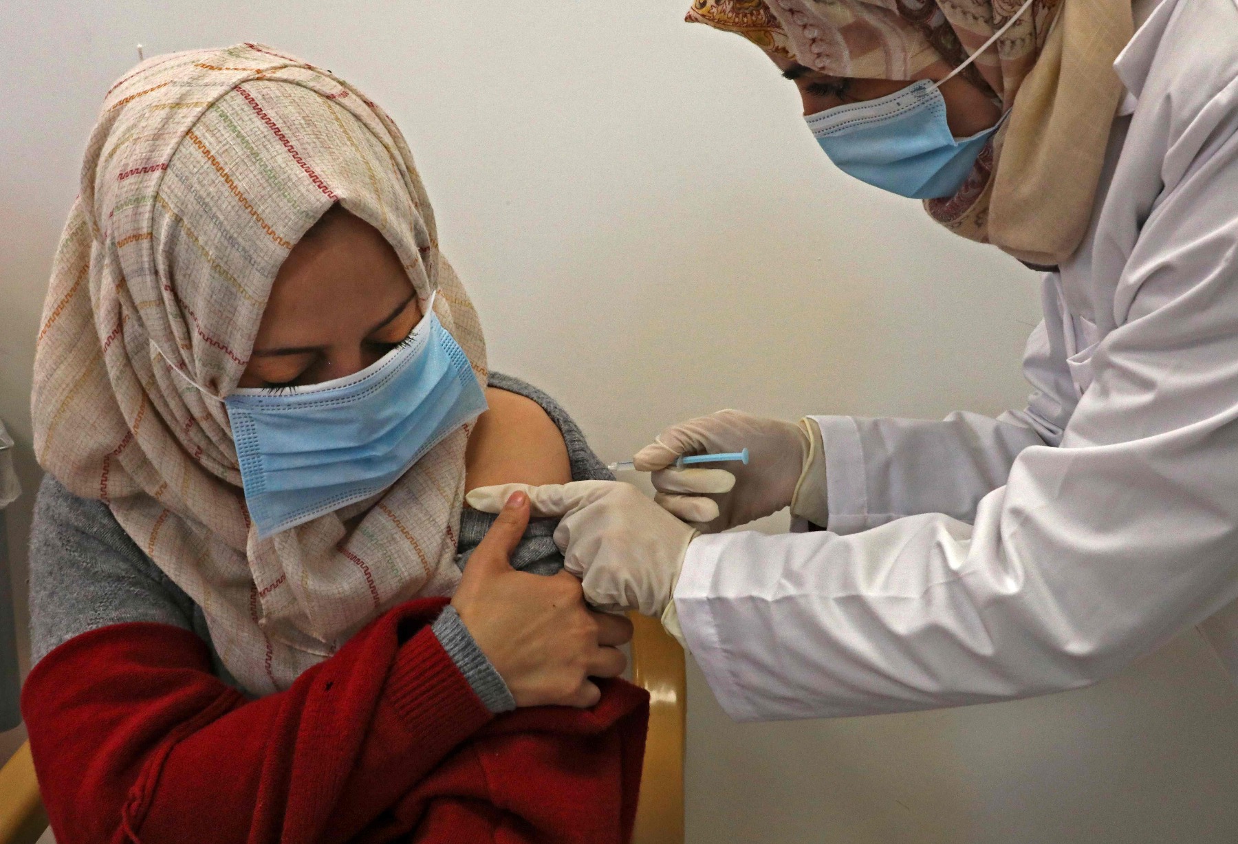 2月4日,在约旦河西岸城市希伯伦,一名巴勒斯坦女子接种新冠疫苗。(新华社/法新)