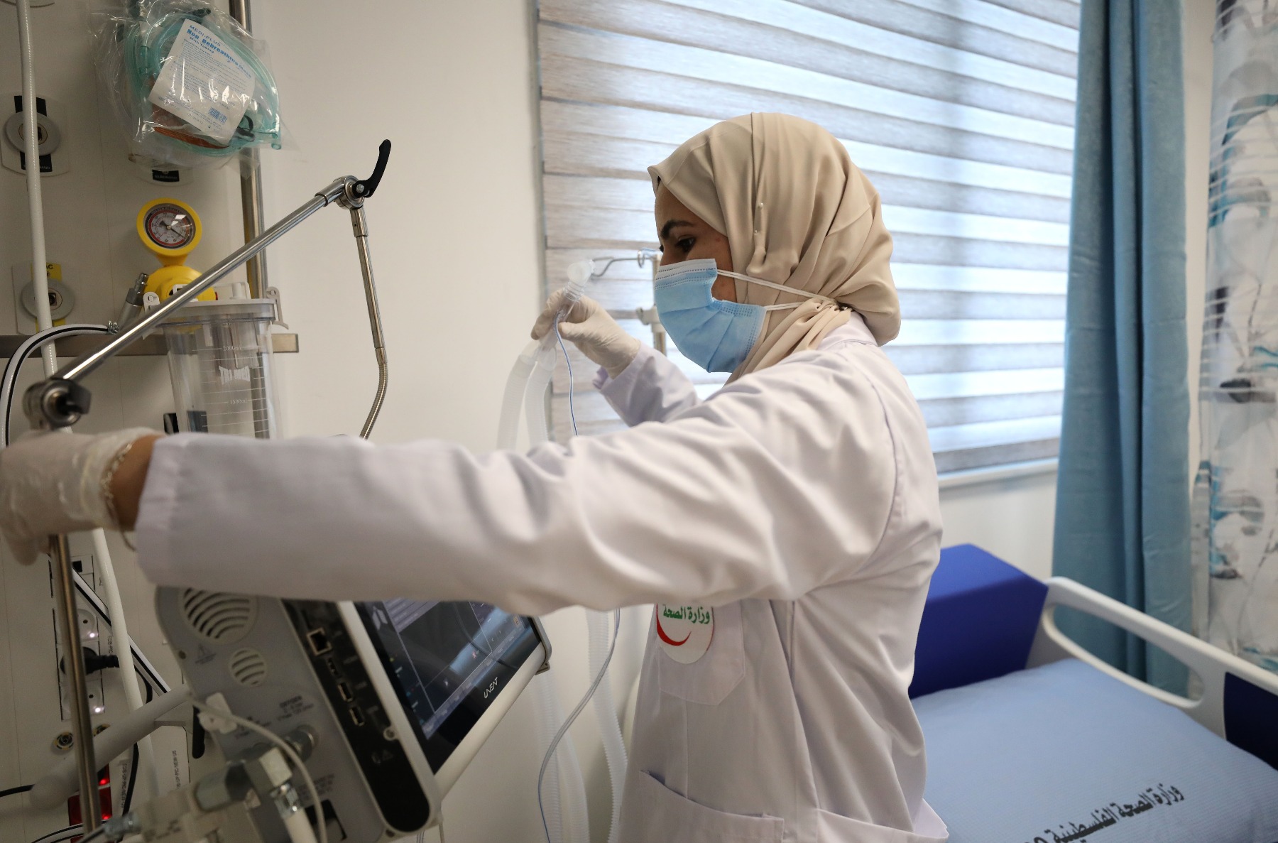 1月16日,在约旦河西岸城市纳布卢斯,一名医护人员在一所新开设的收治新冠患者的医院内工作。(新华社发,艾曼·努巴尼摄)
