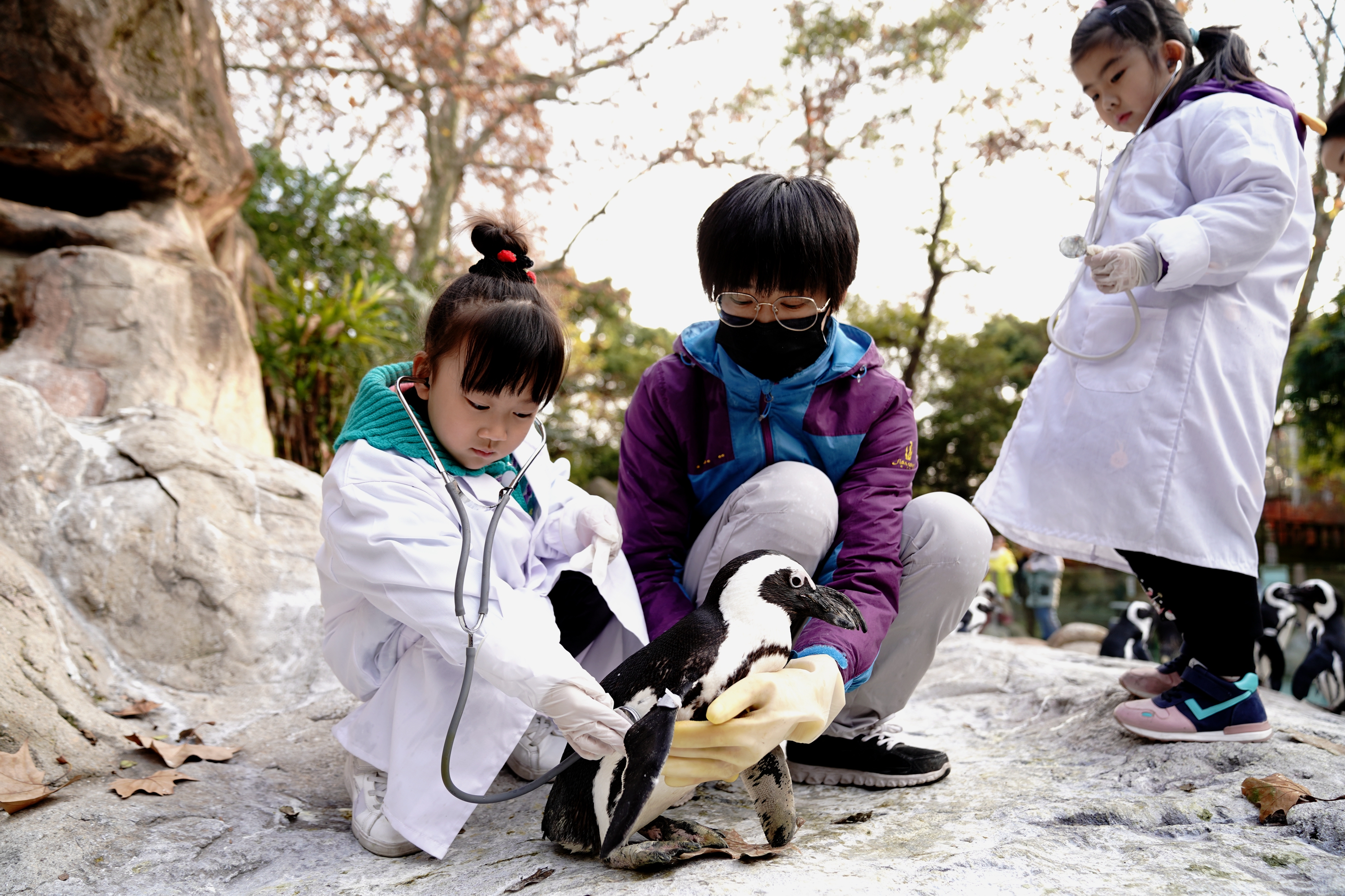 ↑12月19日,小朋友在饲养员指导下给企鹅检查身体。新华社记者张建松摄