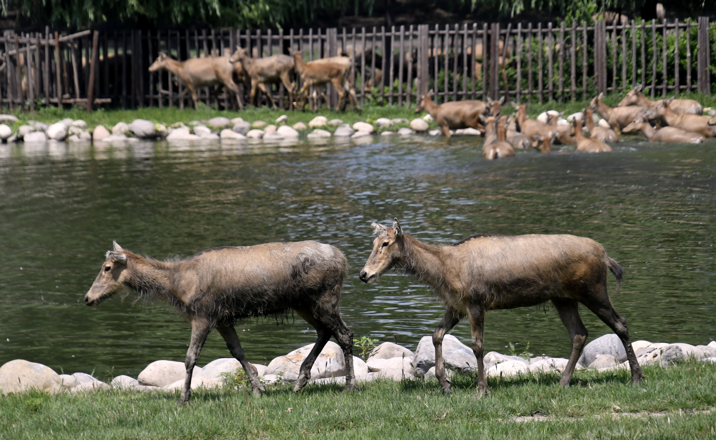 ↑生活在北京大兴区南海子北京麋鹿生态实验中心的麋鹿群。新华社记者李欣摄