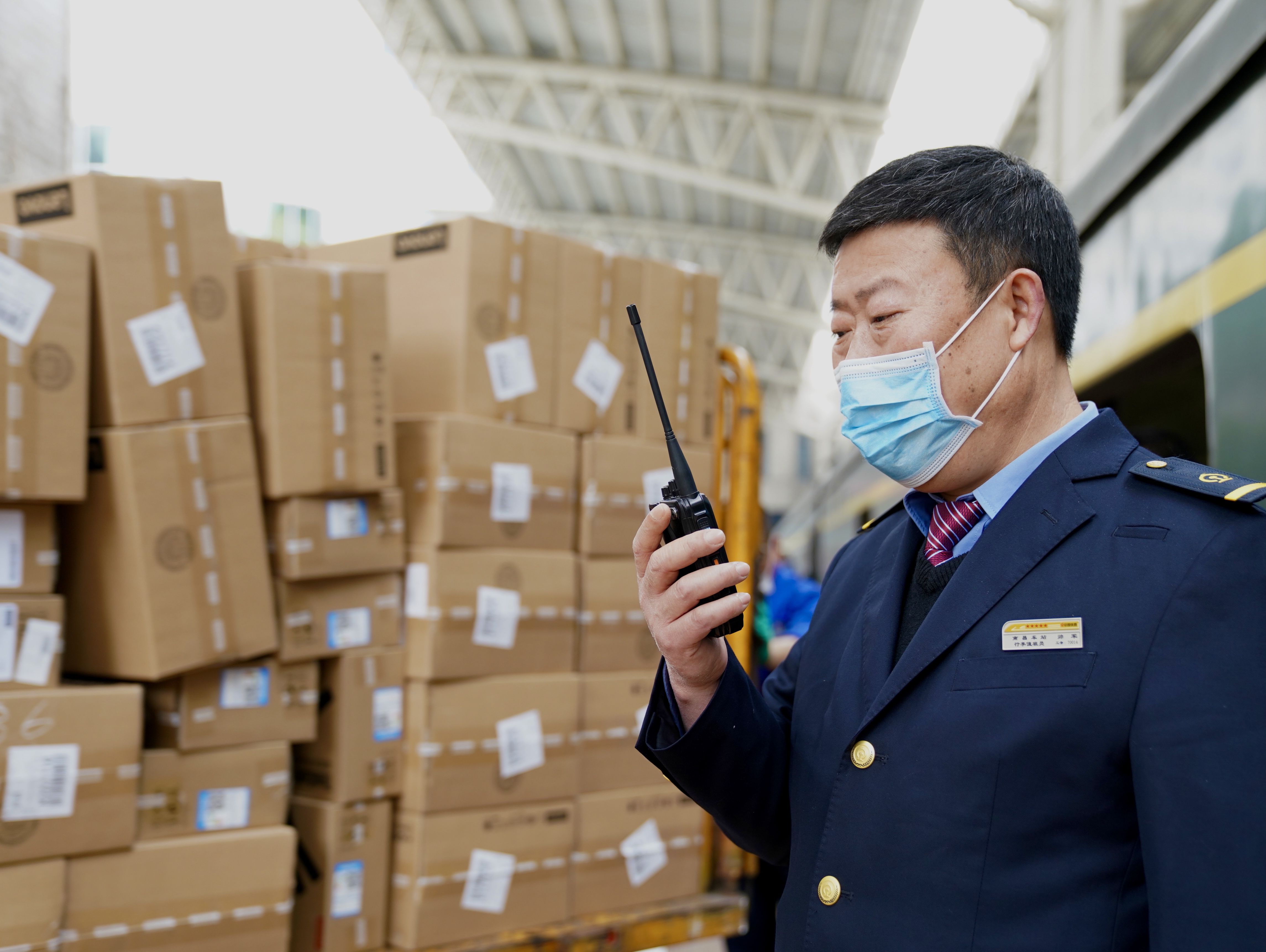 帅军正在站台上指挥调度车站货物运输。(南昌火车站供图)