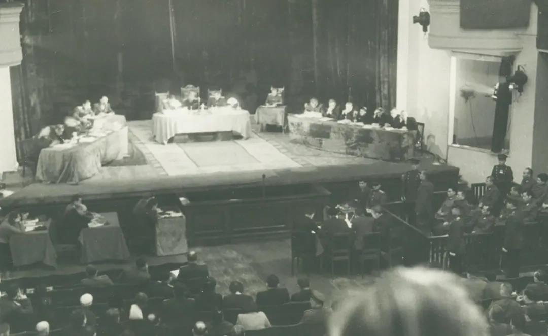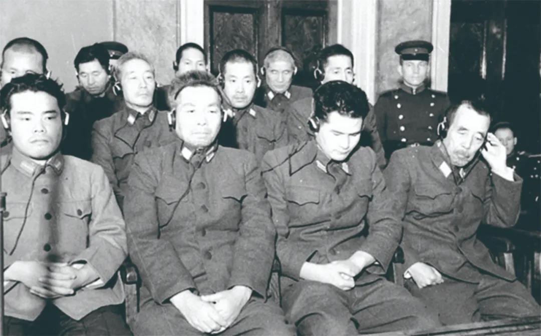 伯力审判中被审判席上的日本战犯,左起分别是 三友一男、川岛清、平樱全作、山田乙三