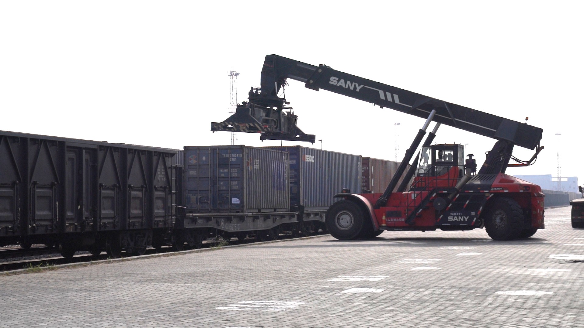 在钦州港东站,工人正在装卸货物。 新华社记者麦凌寒摄