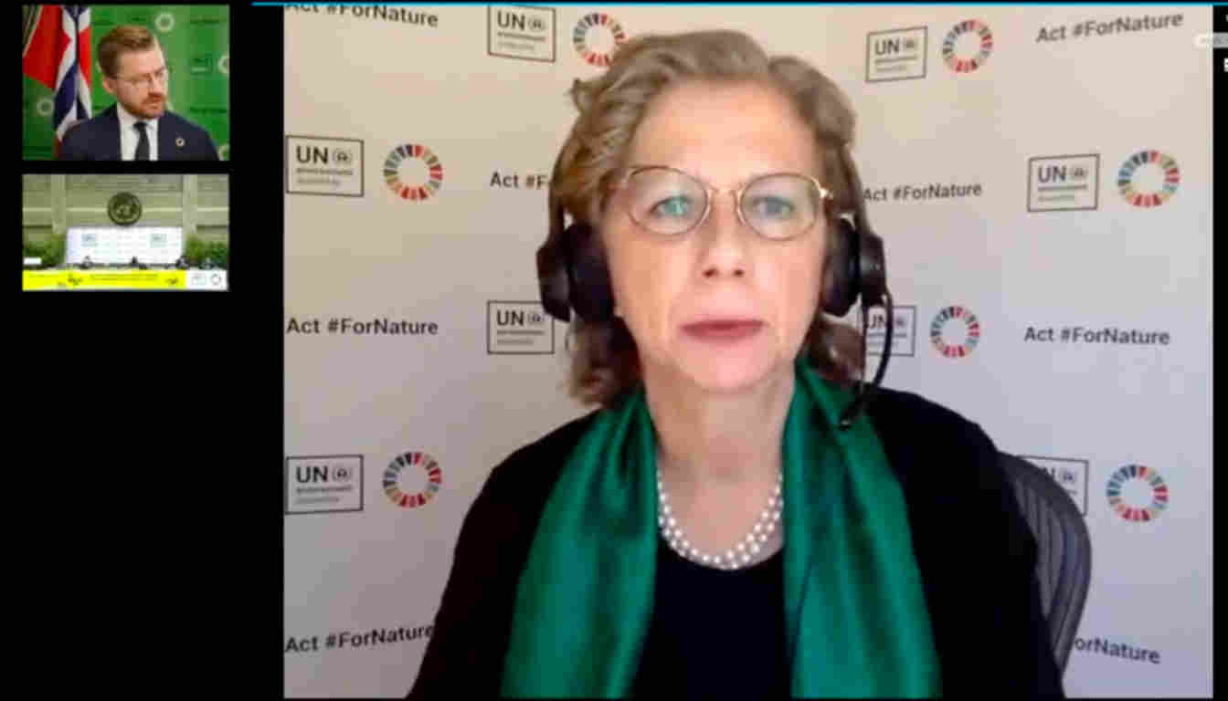 △联合国环境规划署执行主任英厄·安诺生在第五届联合国环境大会线上会议上讲话
