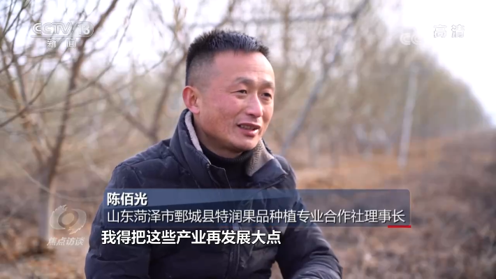 陈佰光是鄄城县旧城镇的种植大户,他不到20岁就到河南跑运输,掌握了果树种植的技术和销售渠道之后,便开始返乡创业。这十年来,一直扎根滩区做农业。春天是种果树的最佳时期,为了争取到因滩区迁建而复垦的土地,陈佰光把乡镇干部邀请到了自家的果园。