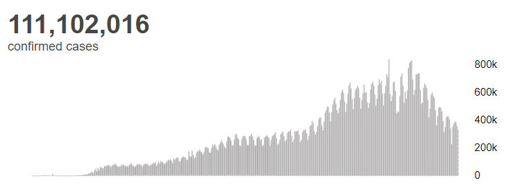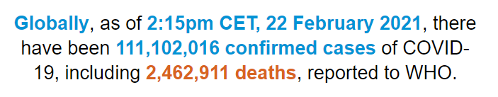 根据世卫组织最新实时统计数据,截至欧洲中部时间2月22日14时15分(北京时间2月22日21时15分),全球累计新冠肺炎确诊病例111102016例,累计死亡病例2462911例。22日全球新冠肺炎确诊病例新增338118例,新增死亡病例7580例。