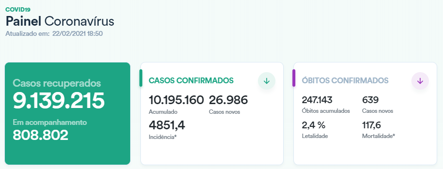 截至当地时间2月22日,据巴西卫生部发布的数据,巴西单日新增新冠肺炎确诊病例26986例,累计确诊10195160例;单日新增死亡639例 ,累计死亡247143例;累计治愈9139215例。