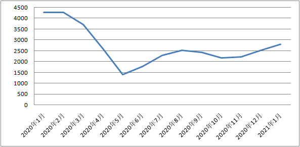 2021年1月,沙特意外宣布将在2月、3月自愿减产100万桶/日,对油价形成较强支撑,加上OPEC增产幅度不及预期等因素,国际油价继续上涨,布伦特原油期货均价环比涨幅约10%,预计2月中国进口保税航空煤油到岸价格将继续上扬。