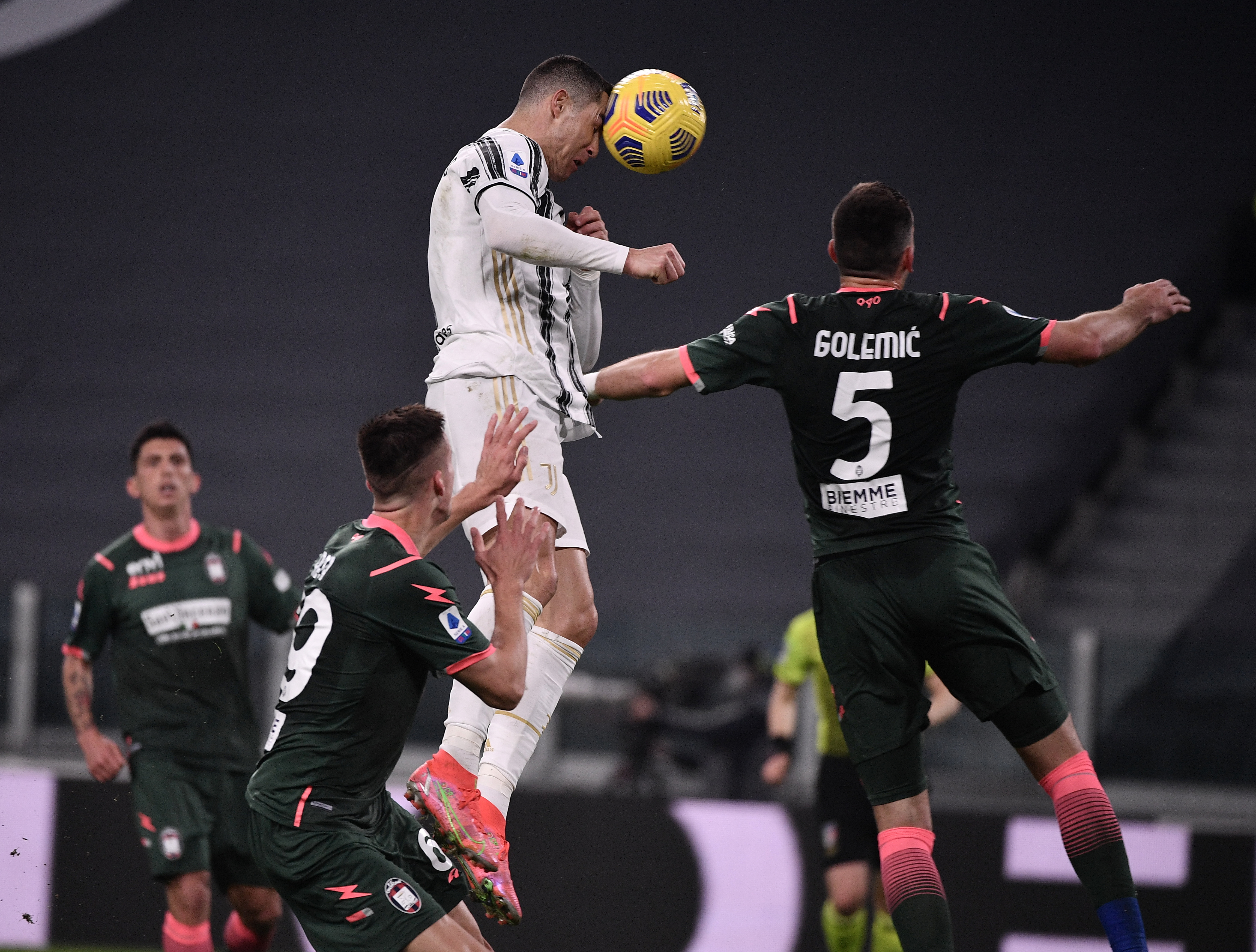 2月22日,尤文图斯队球员克·罗纳尔多(右二)头球破门。新华社发(费代里科·塔尔迪托 摄)