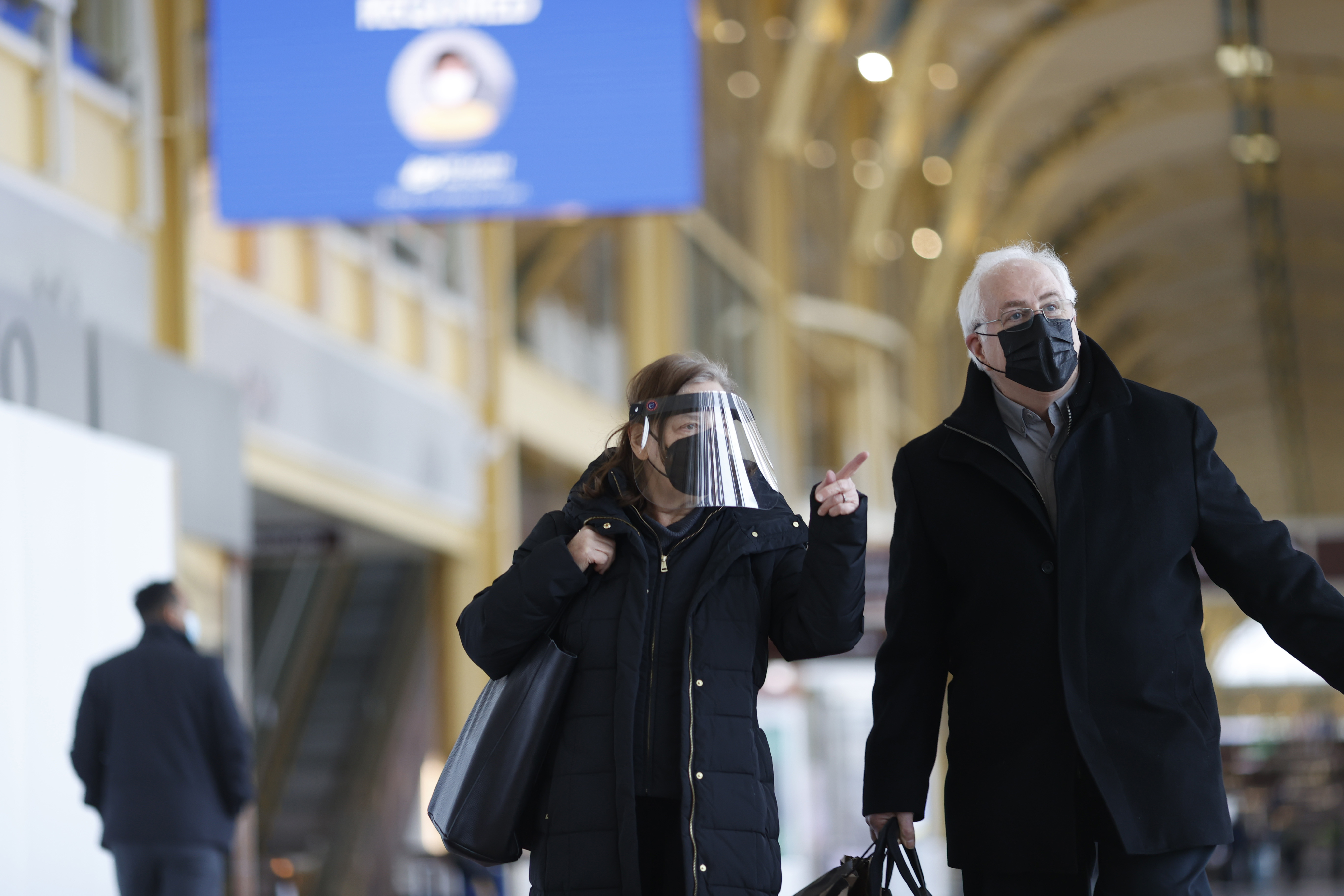 2月2日,在美国弗吉尼亚州阿灵顿的罗纳德·里根华盛顿国家机场,旅客戴着口罩走在航站楼内。(新华社发,沈霆摄)
