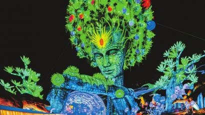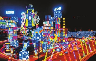 本报讯(四川日报全媒体记者 秦勇文/图)2月22日晚,第27届自贡国际恐龙灯会从“云”上转为线下,在中华彩灯大世界璀璨绽放。
