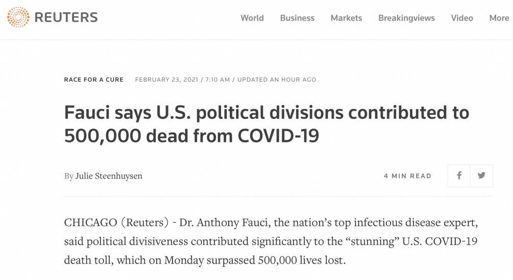 △路透社报道,福奇表示,美国50万人因新冠疫情死亡的原因与政治分裂有关