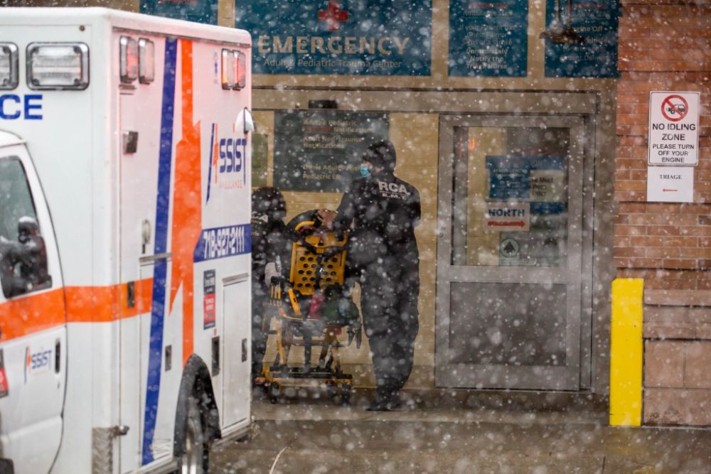 2月22日,美国纽约的医护人员将病人送入一家医院的急诊。(新华社发,郭克摄)