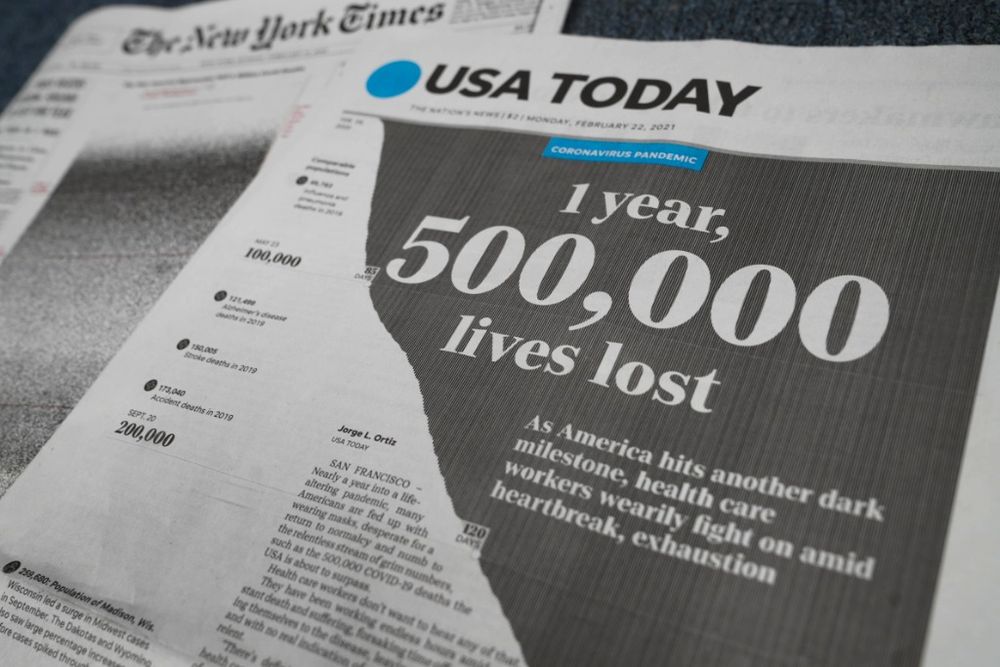 2月22日出版的《今日美国》报头版整版报道美国累计新冠死亡病例超过50万例。(新华社记者王迎摄)