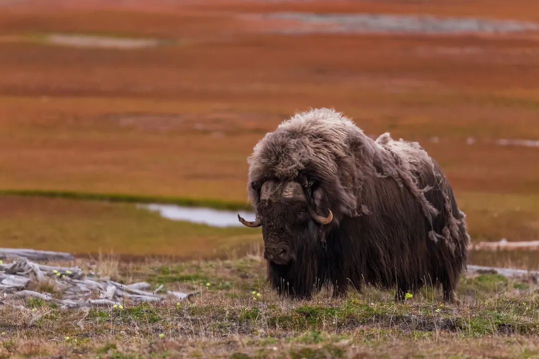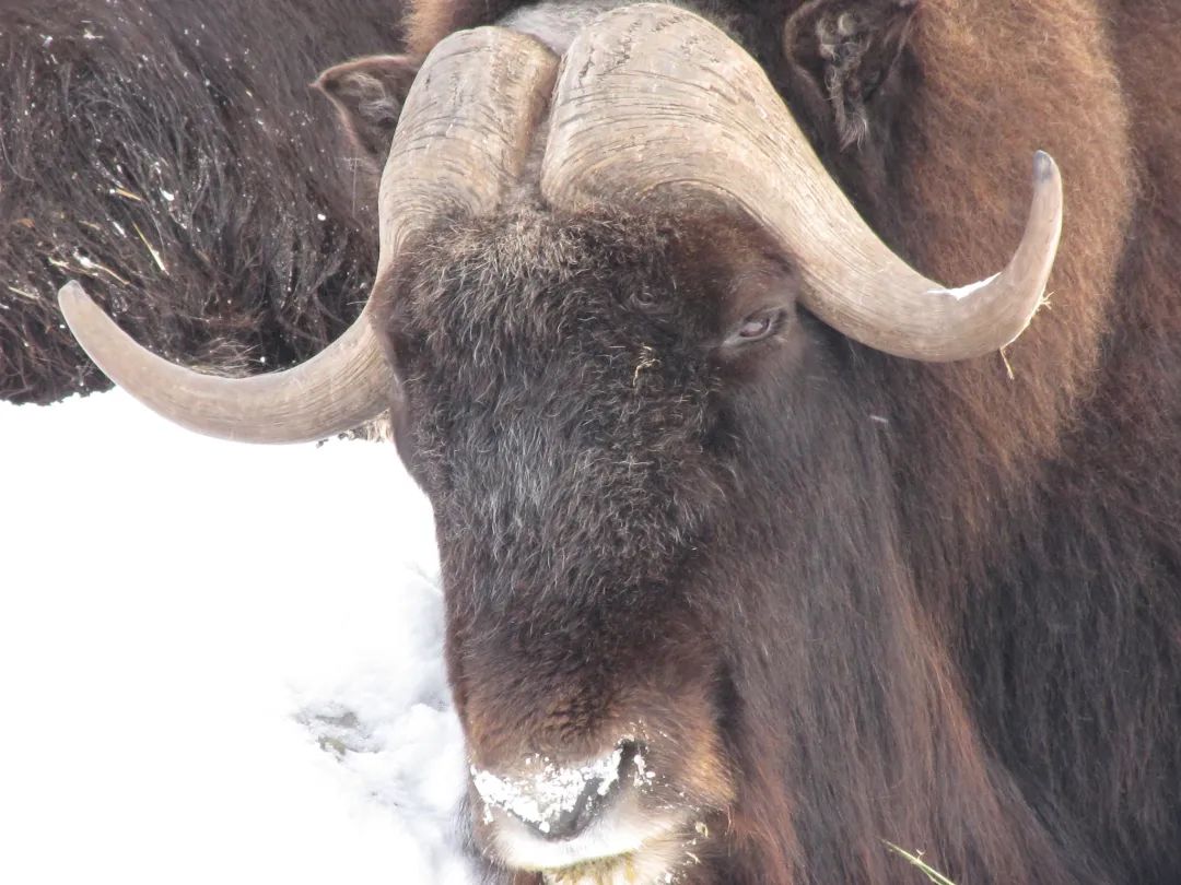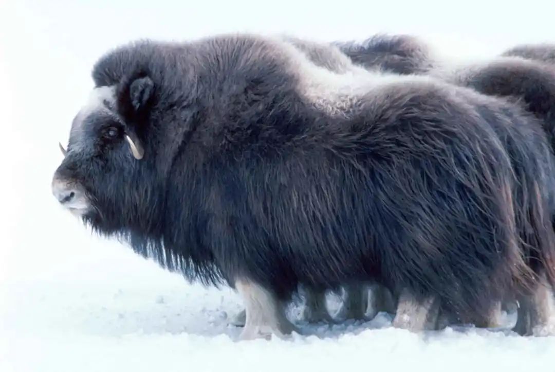 麝牛是极地苔原环境的代表性生物。它全身覆盖着棕色或深褐色的长毛,长到什么程度?麝牛身体上的毛会沿着身体一直生长,能够长到下垂到膝盖之下,甚至麝牛脸上也覆盖着毛发。麝牛脖子处的毛也特别地长,远远的看上去就像是麝牛长着长长的胡子,所以在爱斯基摩人的方言中,麝牛被称为“Oomingmak”,意为“长胡子的”或“毛茸茸的”。