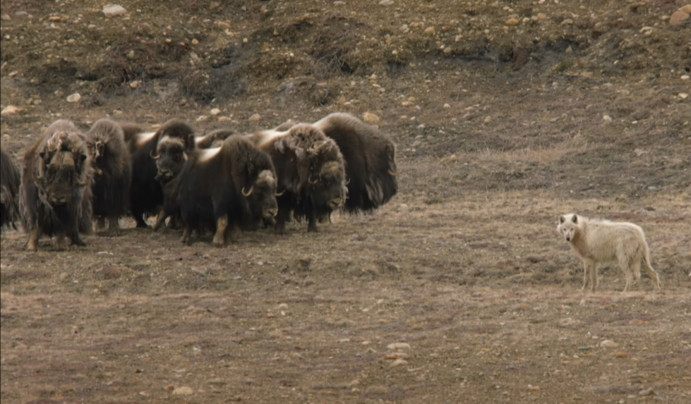 在狼群面前,呈防御姿势的麝牛群 | BBC / Youtube