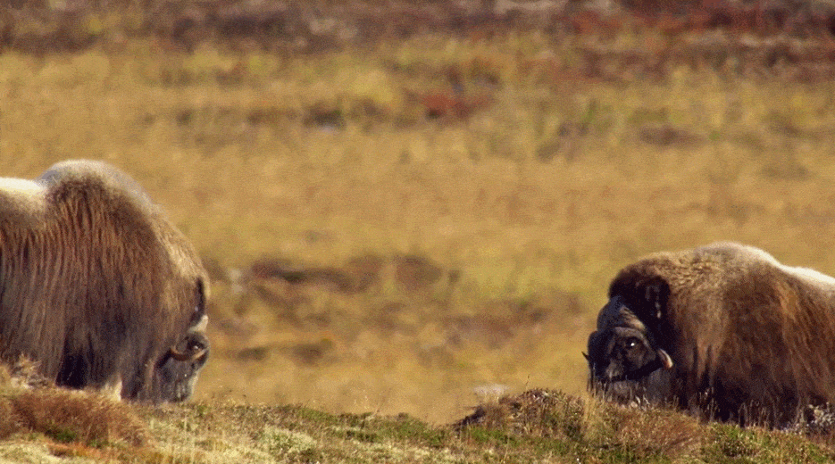 麝牛作为极地苔原生存的大型食草动物,几乎没有什么动物能对麝牛造成威胁,而且麝牛以一头雄性率领数头雌性组成十几只规模的小家庭为单位生活,如果遭遇狼群的侵扰,它们会将幼年和体弱的个体围在群体中间,头朝外用使用犄角对抗,这时就算狼群也很难占到便宜。这个场景不禁让我想到,数万年前同样在北极苔原,身披长毛的猛犸象可能也是用这种方式保护群体中的小象。