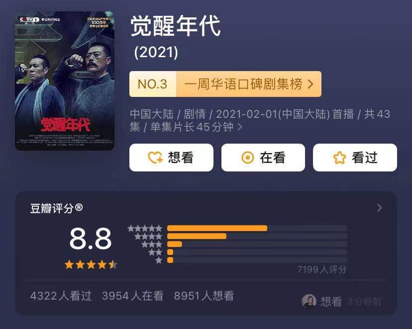 近日,电视剧《觉醒年代》热播,豆瓣8.8分,好评不断。