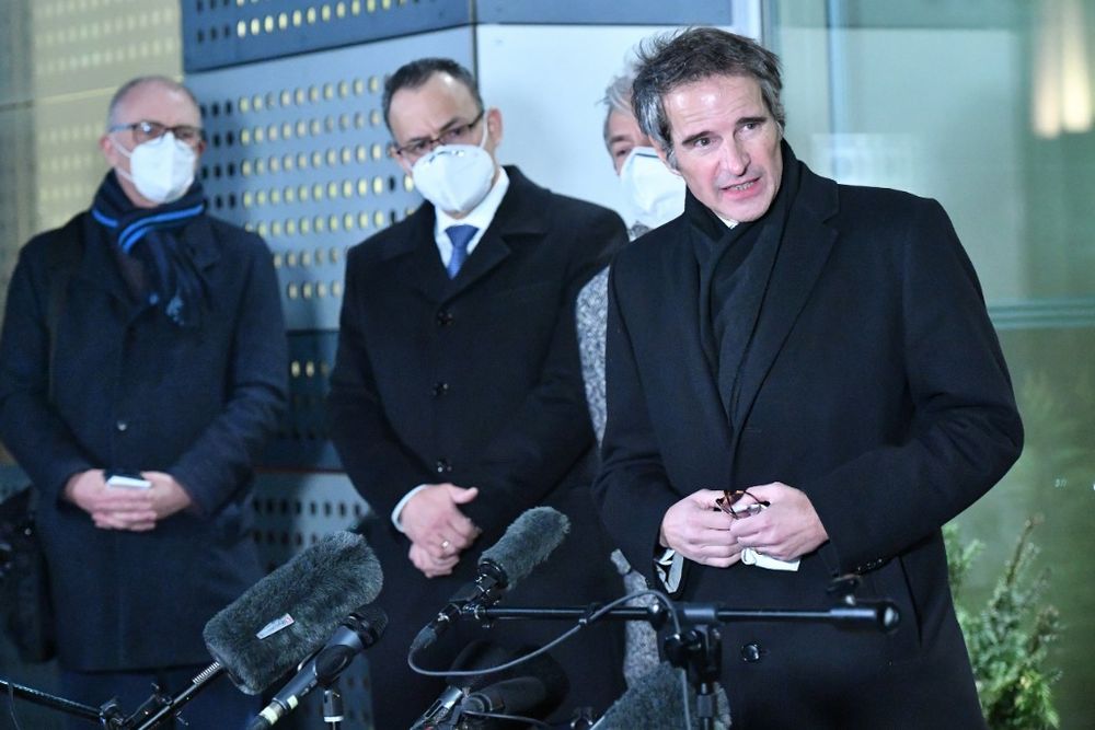 2月21日,国际原子能机构总干事格罗西(右一)在奥地利维也纳国际机场对记者发表讲话。(新华社发,迪恩·卡尔玛/国际原子能机构)