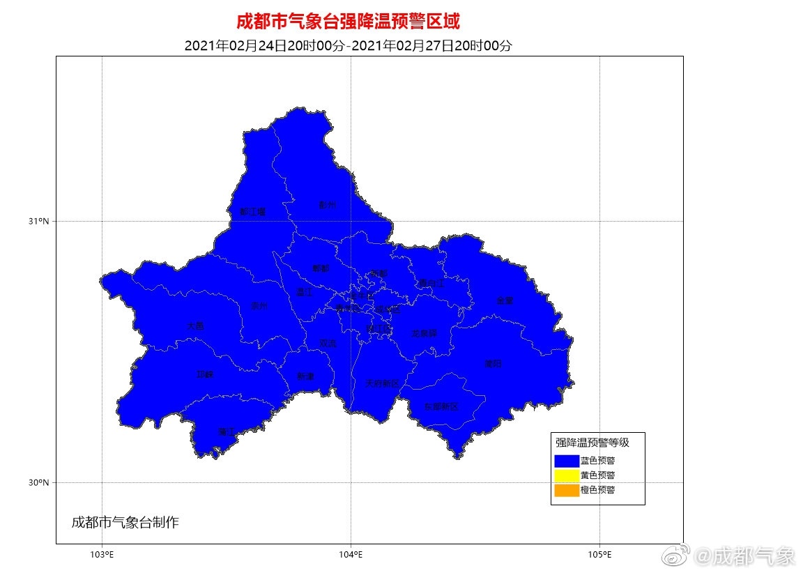 成都市气象台2月23日16时00分发布强降温蓝色预警:受高原低槽和北方冷空气共同影响,预计24~28日我市有一次明显降温降雨天气过程,日平均气温累计下降5~7℃,27~28日最高气温下降至12℃左右,冷空气影响时普遍有3~5级偏北风,东部部分地方可达6级或以上。请注意防范。