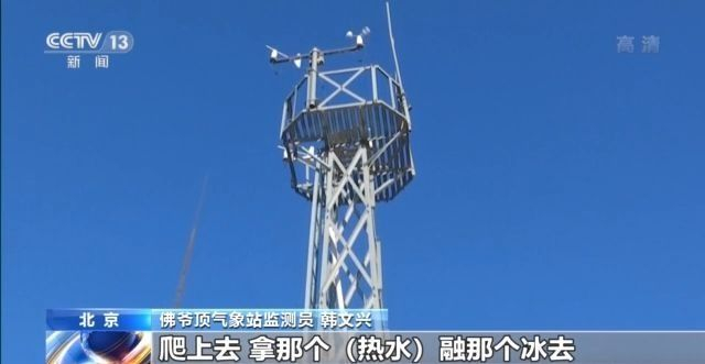 佛爷顶气象站监测员 韩文兴:有时候转的风速低了,它(风速仪)慢慢就能给冻住。原来没安全绳,我自己做一个钩子,拴腰上就爬这顶上去。我挂一瓶矿泉水,热乎的,爬上去,拿那个(热水)融那个冰去。