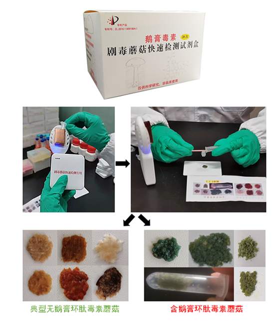 中国科学院昆明植物研究所真菌地衣多样性与适应性进化团队经多年技术攻关,获得一项国家发明专利“一种剧毒蘑菇的快速检测方法”(ZL201610991804.1)授权。通过与企业合作并授权实施许可,完成首批鹅膏环肽毒素剧毒蘑菇快速检测试剂盒产品的研发生产。该试剂盒可在多种条件下(如实验室、野外、营地、卫生所等)3-5分钟内完成含有鹅膏环肽毒素的剧毒蘑菇检测工作(见下图)。该产品特异性地针对鹅膏环肽毒素,通过方便、快捷的特征性蓝绿色显色反应完成检测。鹅膏环肽毒素剧毒蘑菇快速检测试剂盒的成功研发填补了全球该领域的空白,有助于促进包括云南在内的世界野生食用菌产业健康发展。