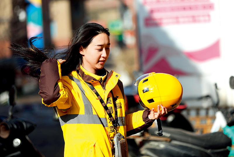 2月10日,美团专送骑手小月月送餐结束回到配送站点 杨青摄/本刊