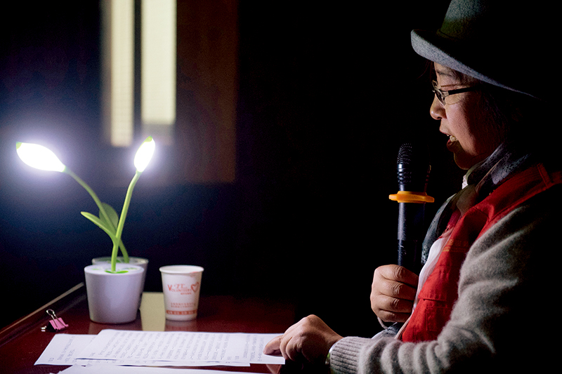 2019年4月11日,无障碍电影解说志愿者吴素环在中国盲文图书馆桐庐县支馆为视障人士解说电影《可可西里》 翁忻旸摄/本刊