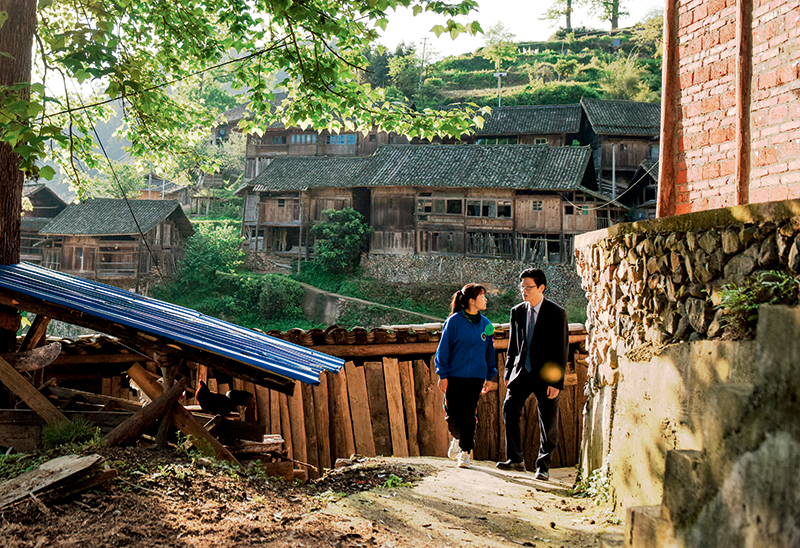 陈立群(右)在台江县台盘乡南庄村家访途中与学生交流(2019年4月16日摄) 杨文斌摄/本刊