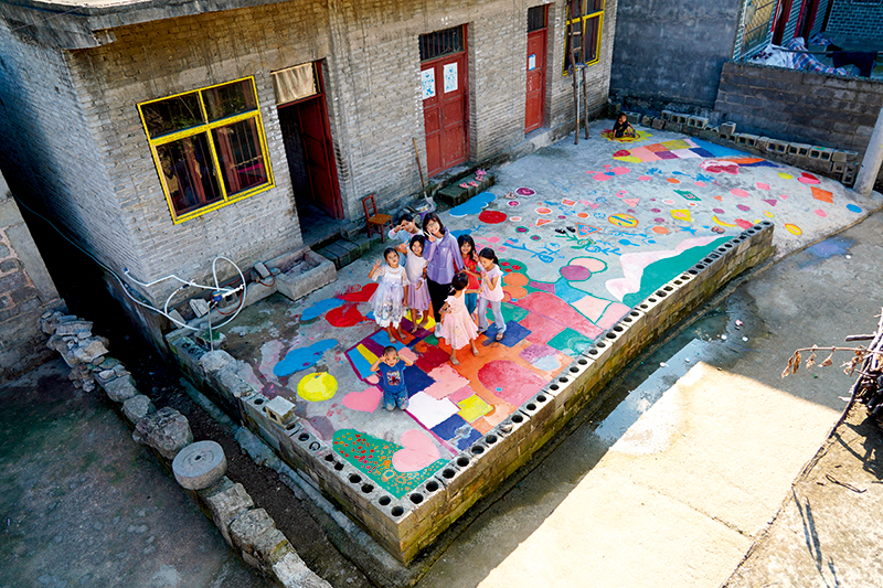 定汪村的孩子们和中国人民大学团队研究生张振馨在共同打造的艺术“跑店乐园”上合影留念 摄影/本刊