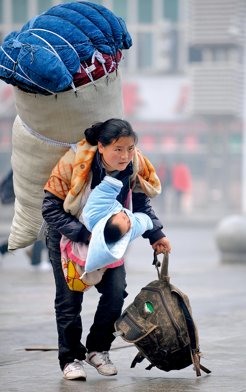 2010年1月30日,巴木玉布木背着大包、抱着孩子在南昌火车站匆忙赶车 周科摄/本刊