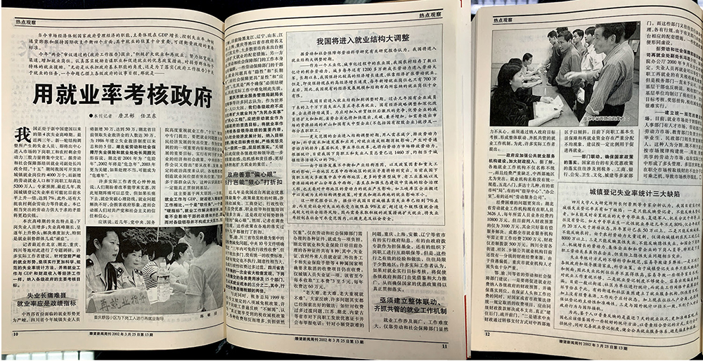 针对这一严峻课题,新华社专门组成“就业问题调研小分队”,集中围绕就业、再就业问题进行一次系统的调查研究。经过两个月的艰辛努力,我们共采发各类稿件近50篇。其中,我和任卫东同志采写的《用就业率考核政府》(刊载于《瞭望》新闻周刊2002年第13期),较早公开提出了“应该将就业率作为政府考核目标”这一重要观点,产生了强烈的反响。