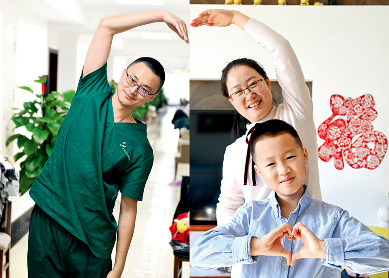 左图为2月9日,吉林大学中日联谊医院内科副主任医师司道远在吉林省通化市医护人员驻地“比心”(许畅摄/本刊);右图为2月9日,司道远的妻子倪璐佳和儿子司统勋在长春市家中“比心”(颜麟蕴摄/本刊)