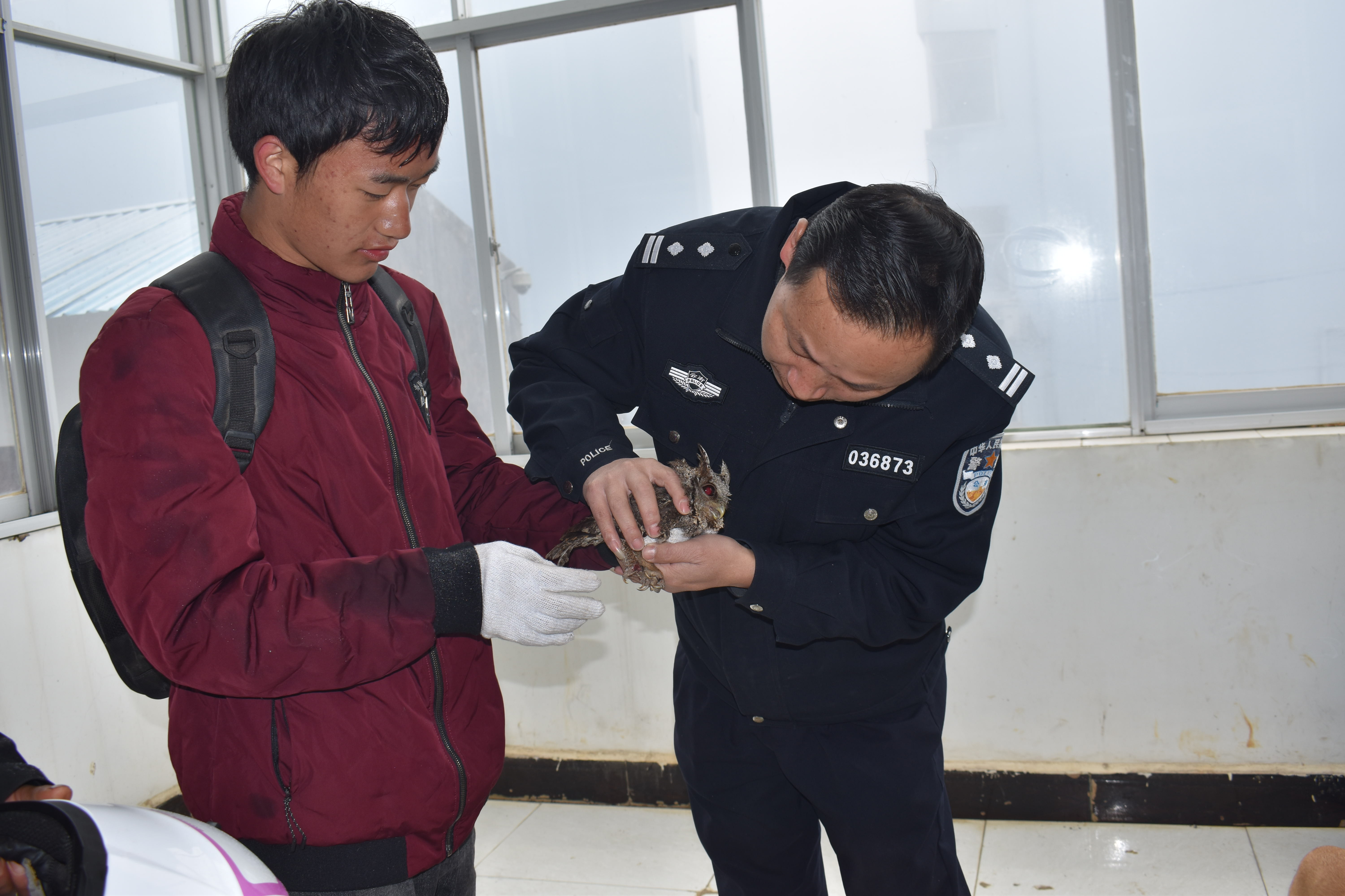 云南省文山壮族苗族自治州丘北县舍得彝族乡一名小伙子近日在路上捡到一只不常见的受伤野鸟,送到派出所。经民警查证,这是一只国家二级保护野生动物雕鸮,警方对雕鸮进行了救治,准备条件具备后放归自然。
