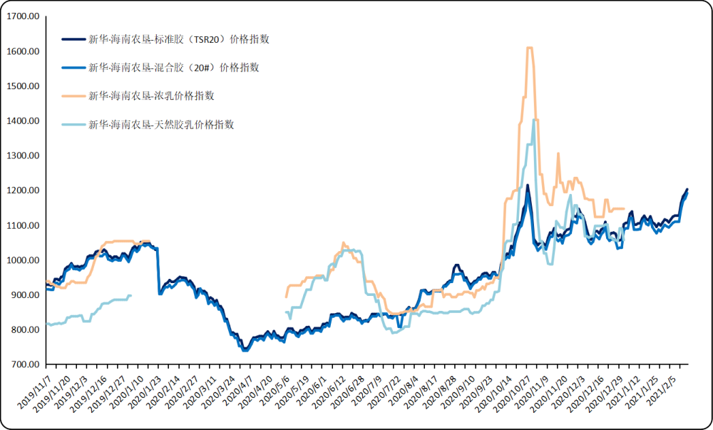 新华·海南农垦-天然橡胶系列价格指数显示,截至2月22日,标准胶(TSR20)价格指数报1202.79点,较2月8日(下同)上涨6.73%;混合胶(20#)价格指数报1191.85点,上涨7.41%。