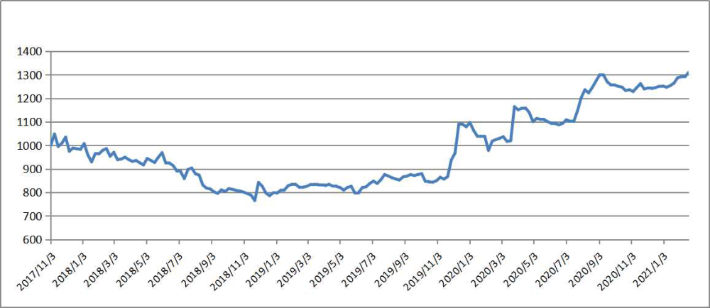 2月19日,指数报1310.62点,较上期(2021.2.1-2.7下同)上涨19.24点,涨幅1.49%,与基期相比上涨310.62点,涨幅31.06%。