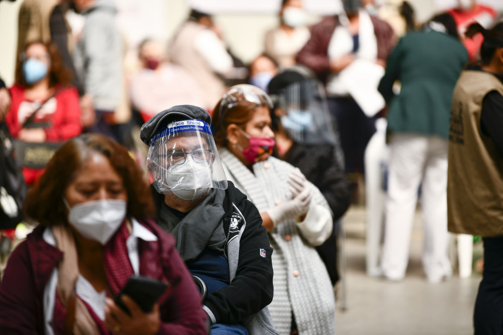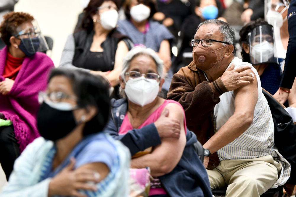 2月22日,在墨西哥墨西哥州埃卡特佩克市,老年人在接种中国科兴新冠疫苗后进行过敏观察。新华社记者辛悦卫摄