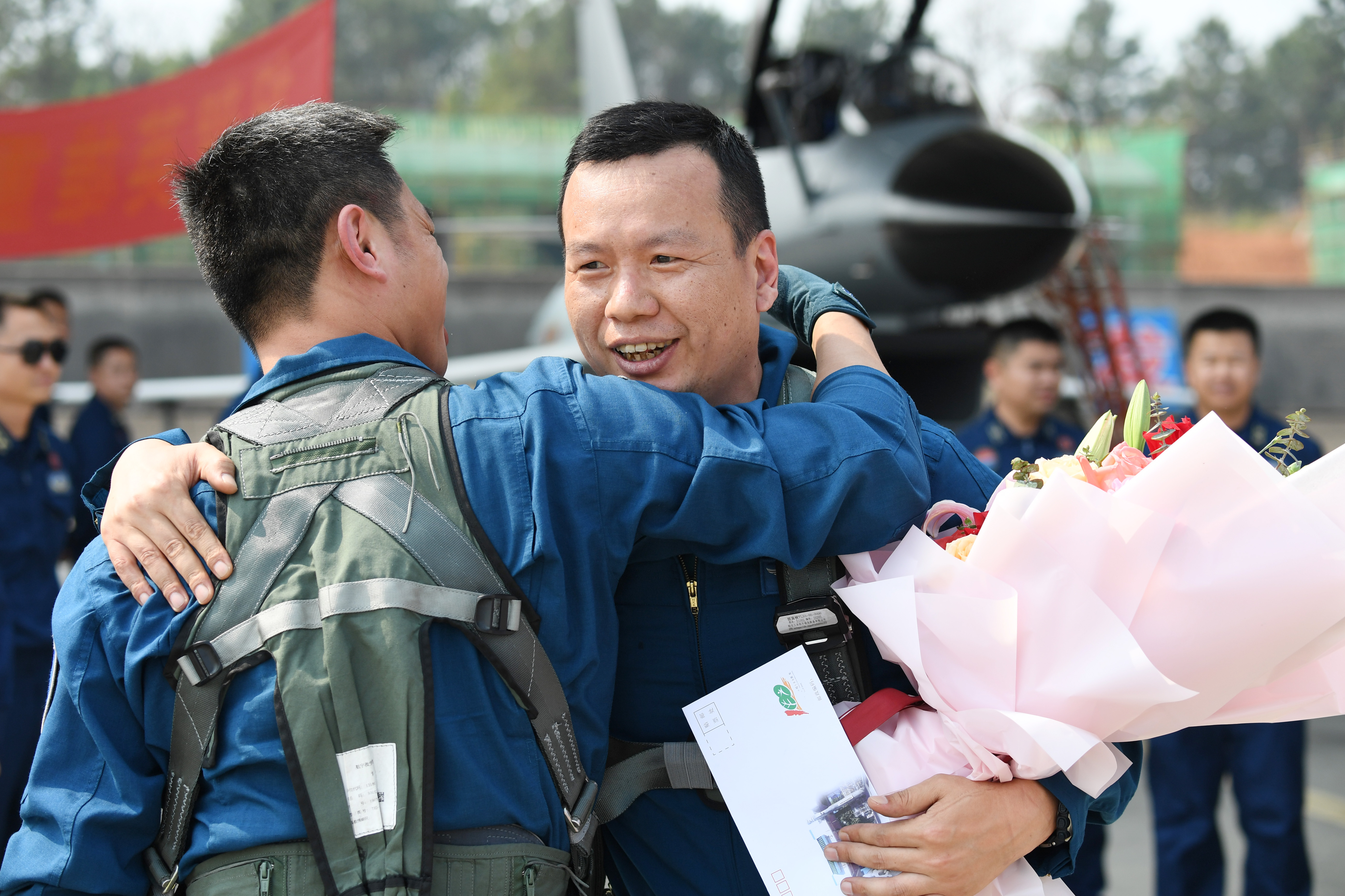 ↑2月23日,复飞重返战位的一等功空军飞行员王建东完成飞行计划后,与战友拥抱庆祝。唐俊 摄