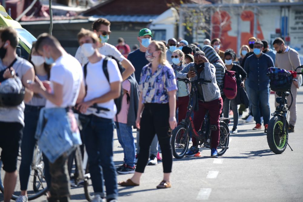 2月9日,在以色列特拉维夫苏拉斯基医疗中心,民众排队等待接种新冠疫苗。(新华社/基尼图片社)