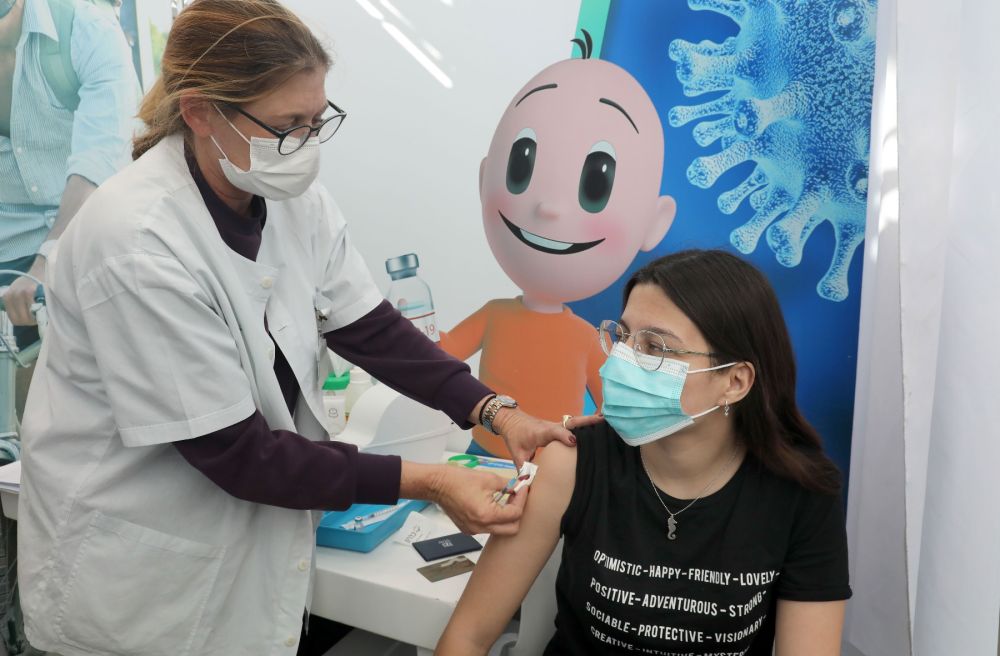 1月23日,在以色列中部城市特拉维夫的一处卫生服务站内,一名女孩接种新冠疫苗。(新华社/基尼图片社)